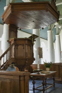 Boven de aan een pilaar hangende preekstoel is een zeshoekig klankbord aangebracht, met daarop een versiering met het jaartal 1702. Het is een wapenbord, met een kroon daarboven en vastgehouden door 2 adelaars. De adelaar met haar beschuttende vleugels, het symbool van het evangelie der genade. Het wapen werd tijdens de Franse revolutie verwijderd en vervangen door houtwerk waarop lijnen werden aangebracht. In die tijd werden vele wapens afgehakt, verwijderd of onzichtbaar gemaakt. Aan de spreekstoel werd een geel koperen lessenaar bevestigd. Waarop een kanselbijbel, geschenk anno 1867 van Ds. Theesing, die toen predikant was van deze gemeente.